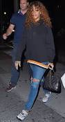 Rihanna rocks a low-key look in distressed jeans and a baggy black hoodie as she struggles to ... Wearing a baggy black hoodie - that featured a partially un-stitched hem - and a pair of ripped and distressed blue denim jeans, Rihanna went for ...