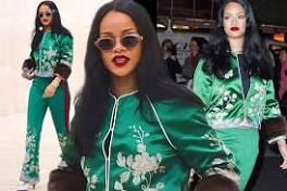 Rihanna leaves fans green with envy as she shows off her quirky style in a bright floral tracksuit Rihanna's hair was worn loose and she added an extra touch of glam with some bright red lipstick. She didn't scrimp on the accessories with bangles, ...