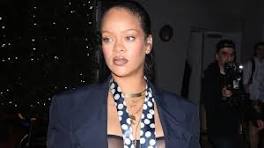 Rihanna Wears See-Through Fenty Bra and Polkadot Tie for a Chic Maternity Look - ELLE Rihanna wore a sheer Fenty bra to dinner at Giorgio Baldi in Santa Monica with a matching blazer and pants set.